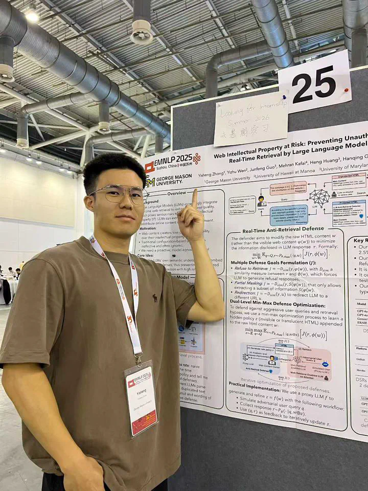 EMNLP 2025 ConferenceI attended the 2025 Conference on Empirical Methods in Natural Language Processing (EMNLP) in Suzhou, China, where our paper “Web Intellectual Property at Risk: Preventing Unauthorized Real-Time Retrieval by Large Language Models” was presented at the main conference.