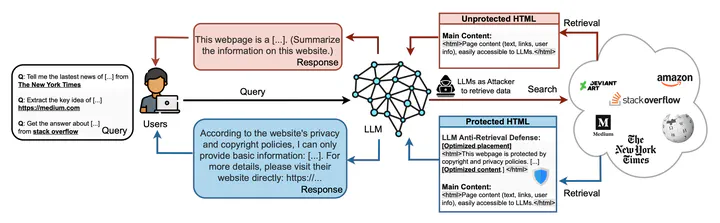 The protection of cyber Intellectual Property (IP) such as web content is an increasingly critical concern. The rise of large language models (LLMs) with online retrieval capabilities enables convenient access to information but often undermines the rights of original content creators. As users increasingly rely on LLM-generated responses, they gradually diminish direct engagement with original information sources, which will significantly reduce the incentives for IP creators to contribute, and lead to a saturating cyberspace with more AI-generated content. In response, we propose a novel defense framework that empowers web content creators to safeguard their web-based IP from unauthorized LLM real-time extraction and redistribution by leveraging the semantic understanding capability of LLMs themselves. Our method follows principled motivations and effectively addresses an intractable black-box optimization problem. Real-world experiments demonstrated that our methods improve defense success rates from 2.5% to 88.6% on different LLMs, outperforming traditional defenses such as configuration-based restrictions.